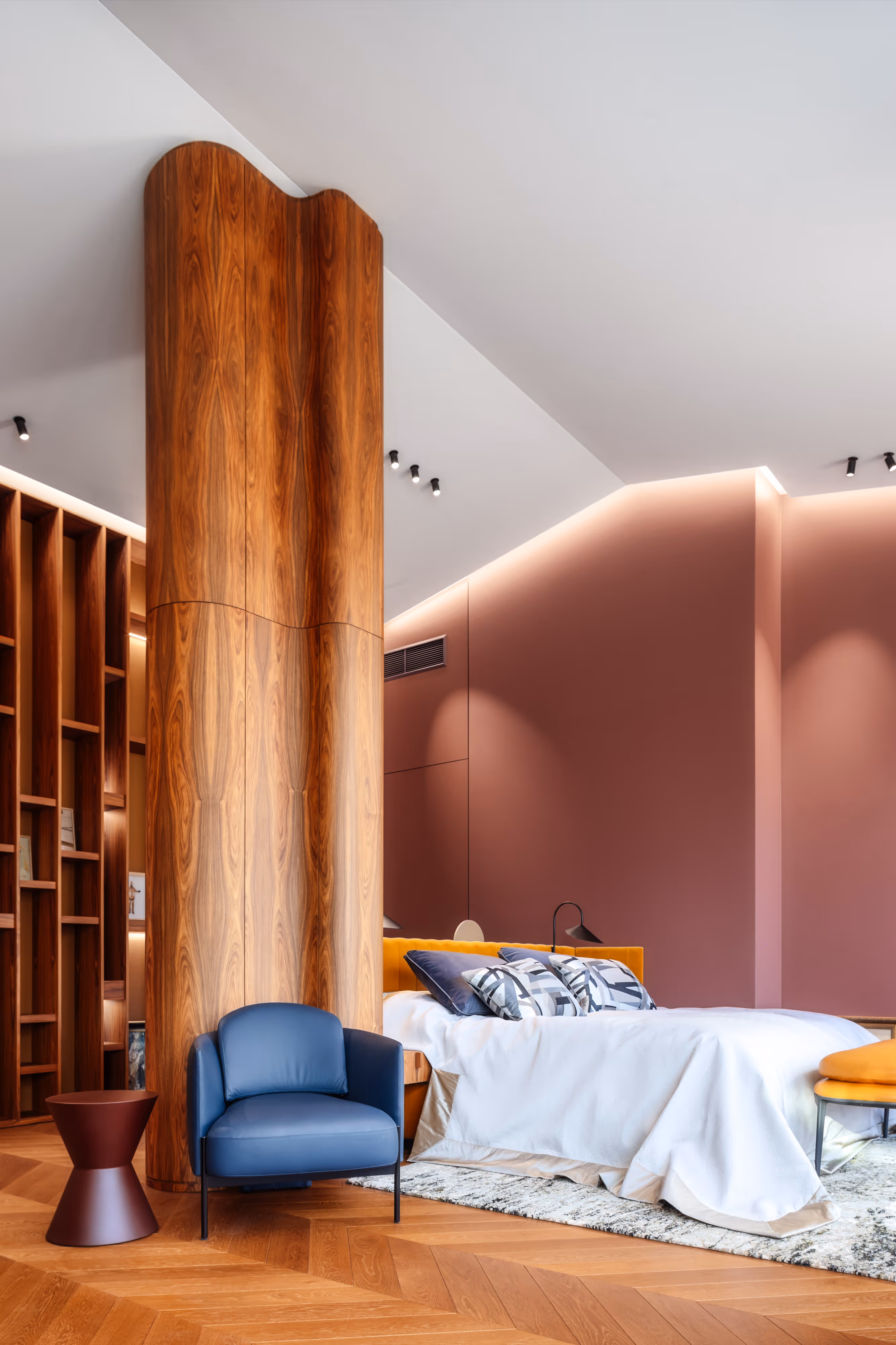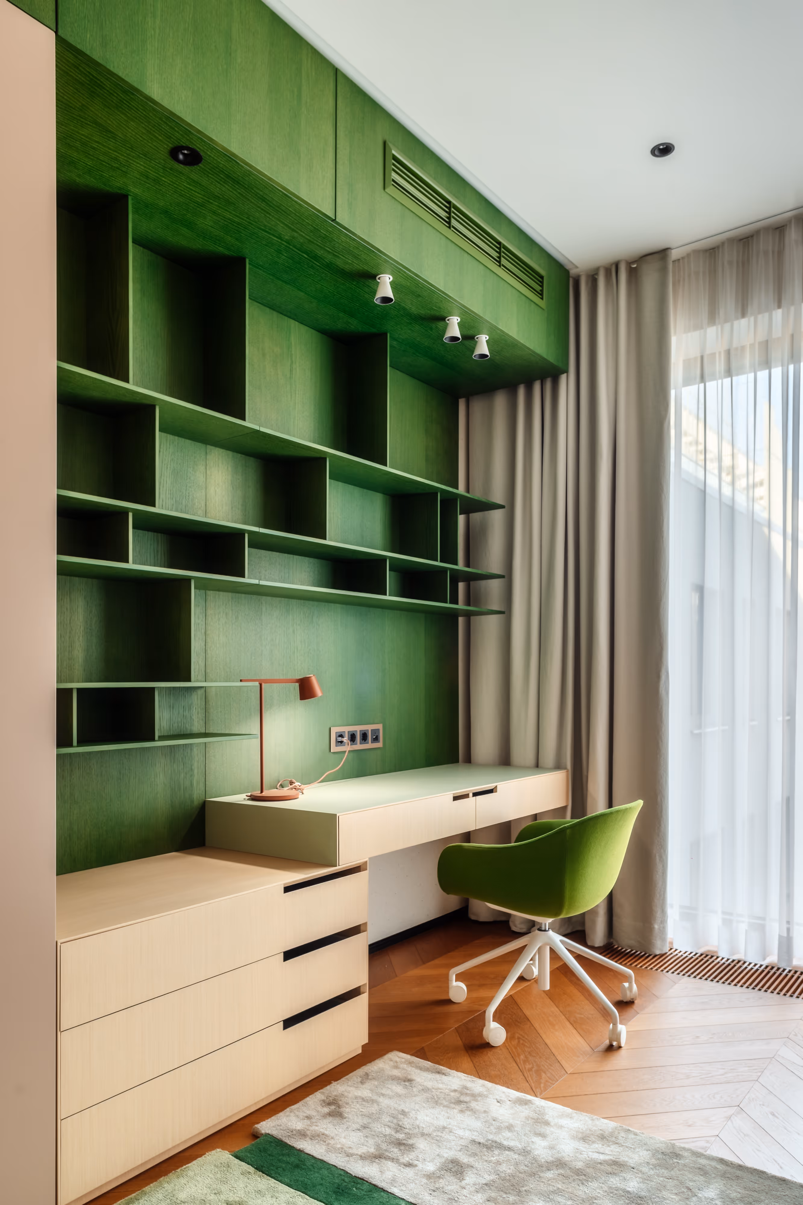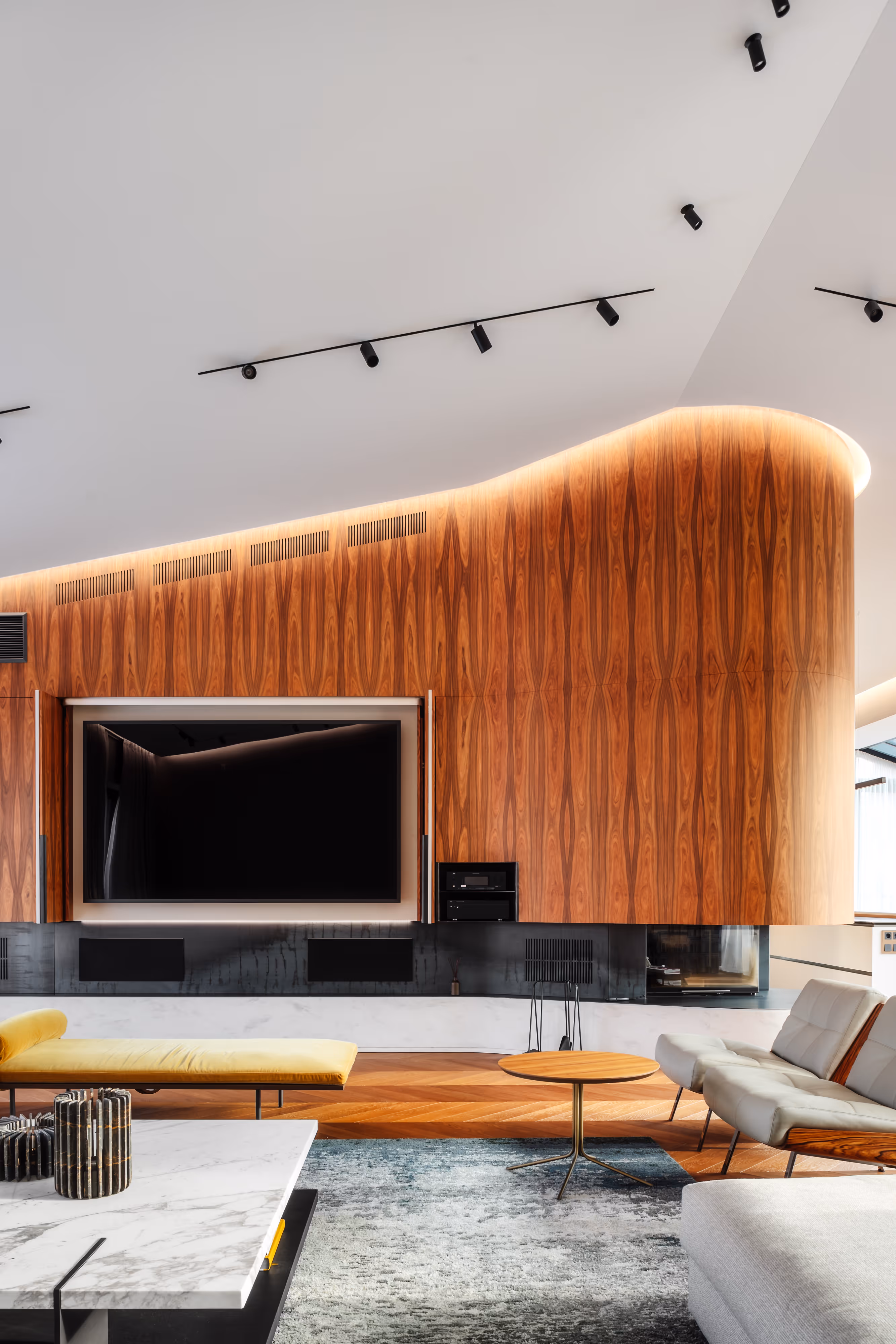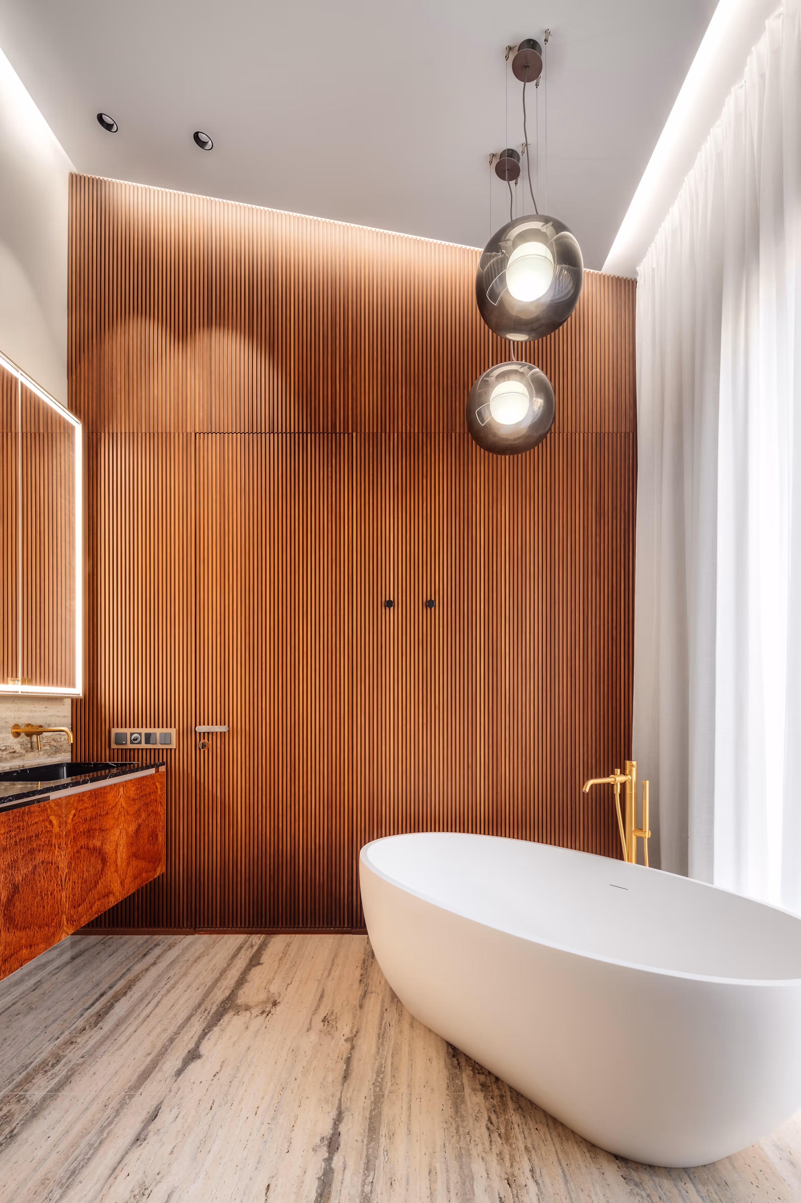 To implement an interior in one of Riga’s most unique buildings — where historic architecture meets contemporary volumes and floating gardens. We needed to unite two apartments while preserving natural light, open views, and architectural character.