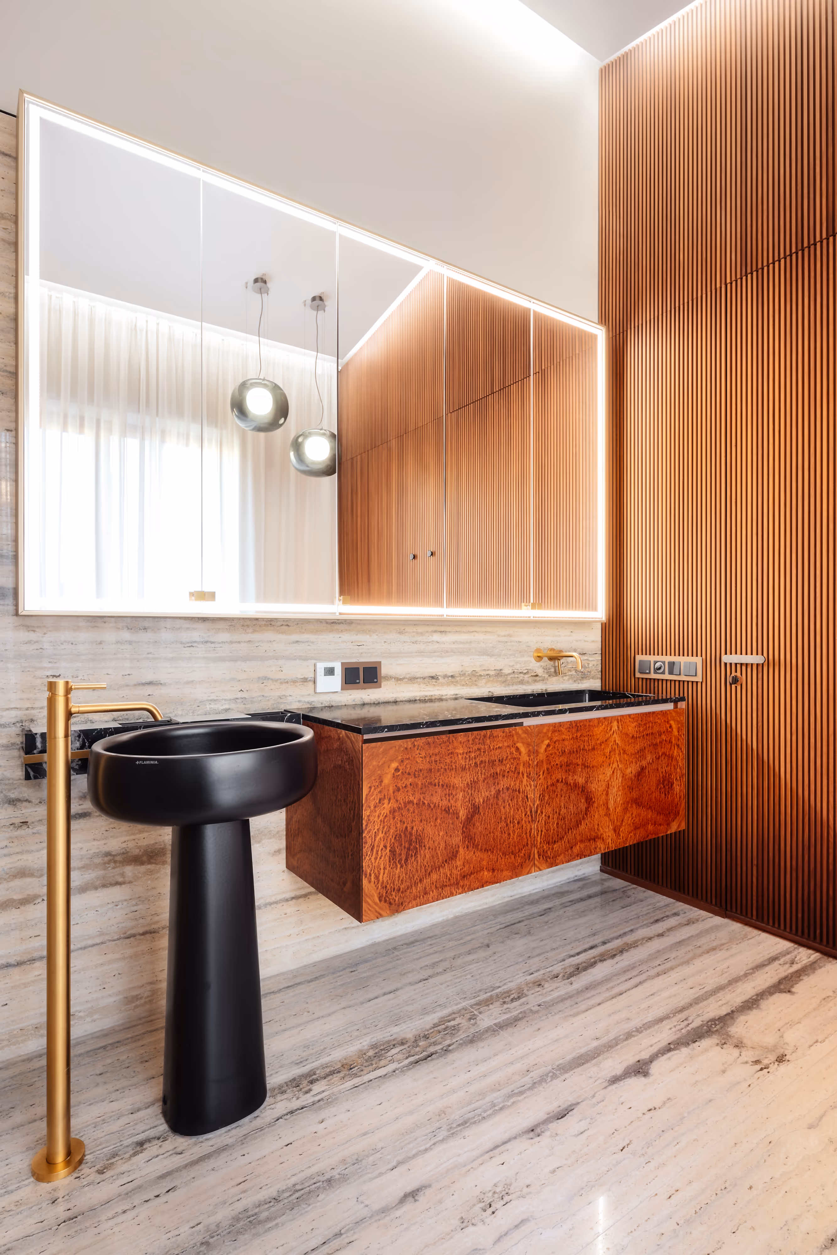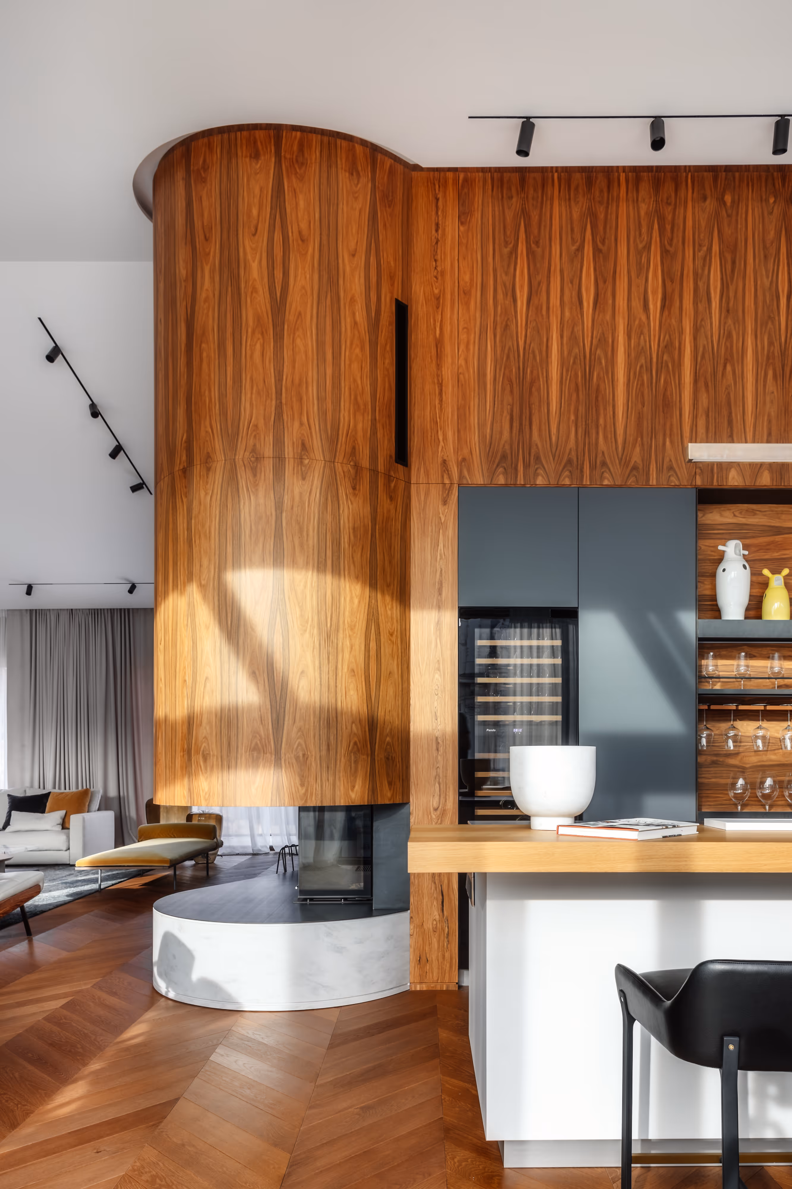 We paid special attention to furnishing: furniture and appliances were selected from leading European brands, while a custom-made console with hand engraving echoes the silhouette of the building opposite — a tribute to detail.