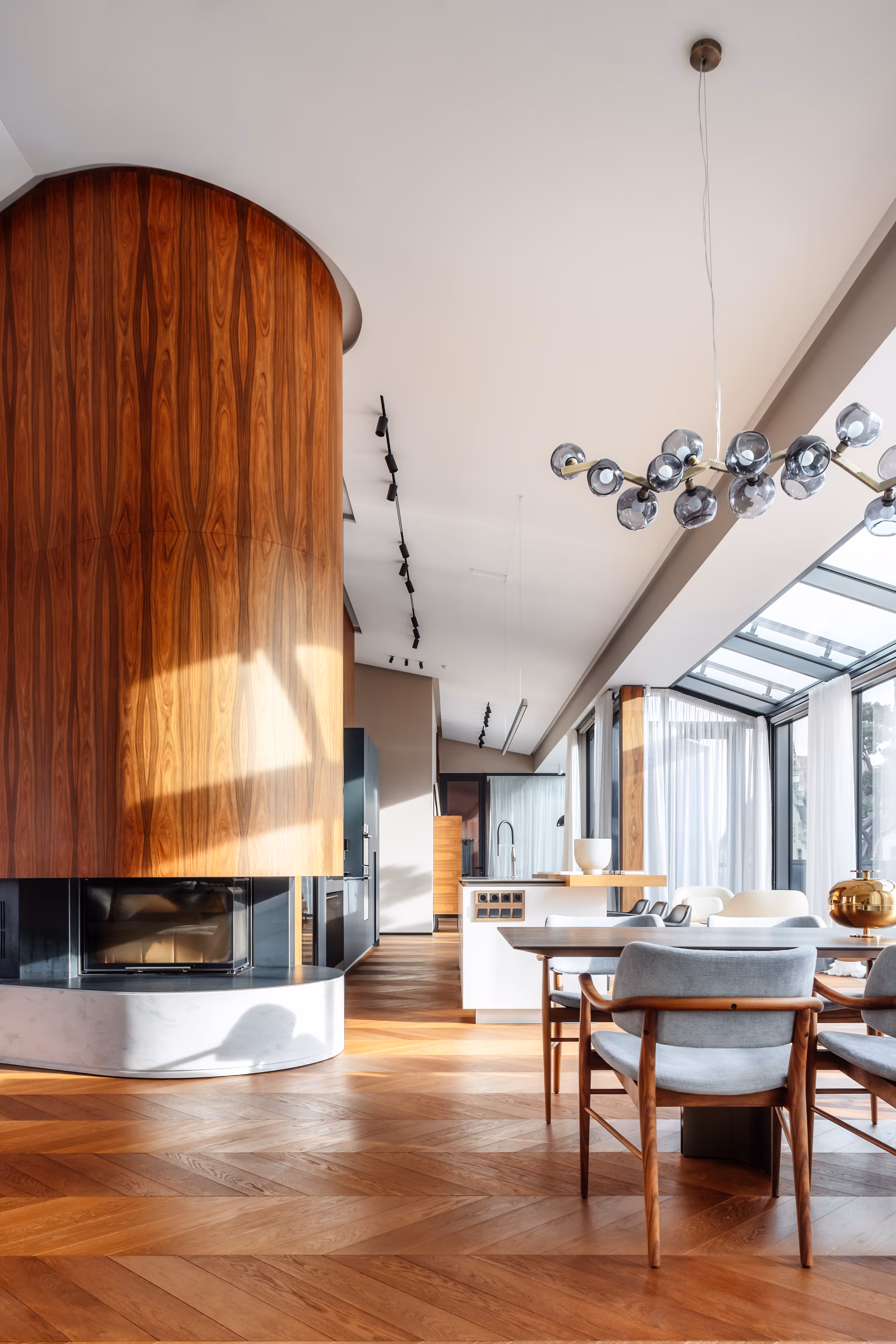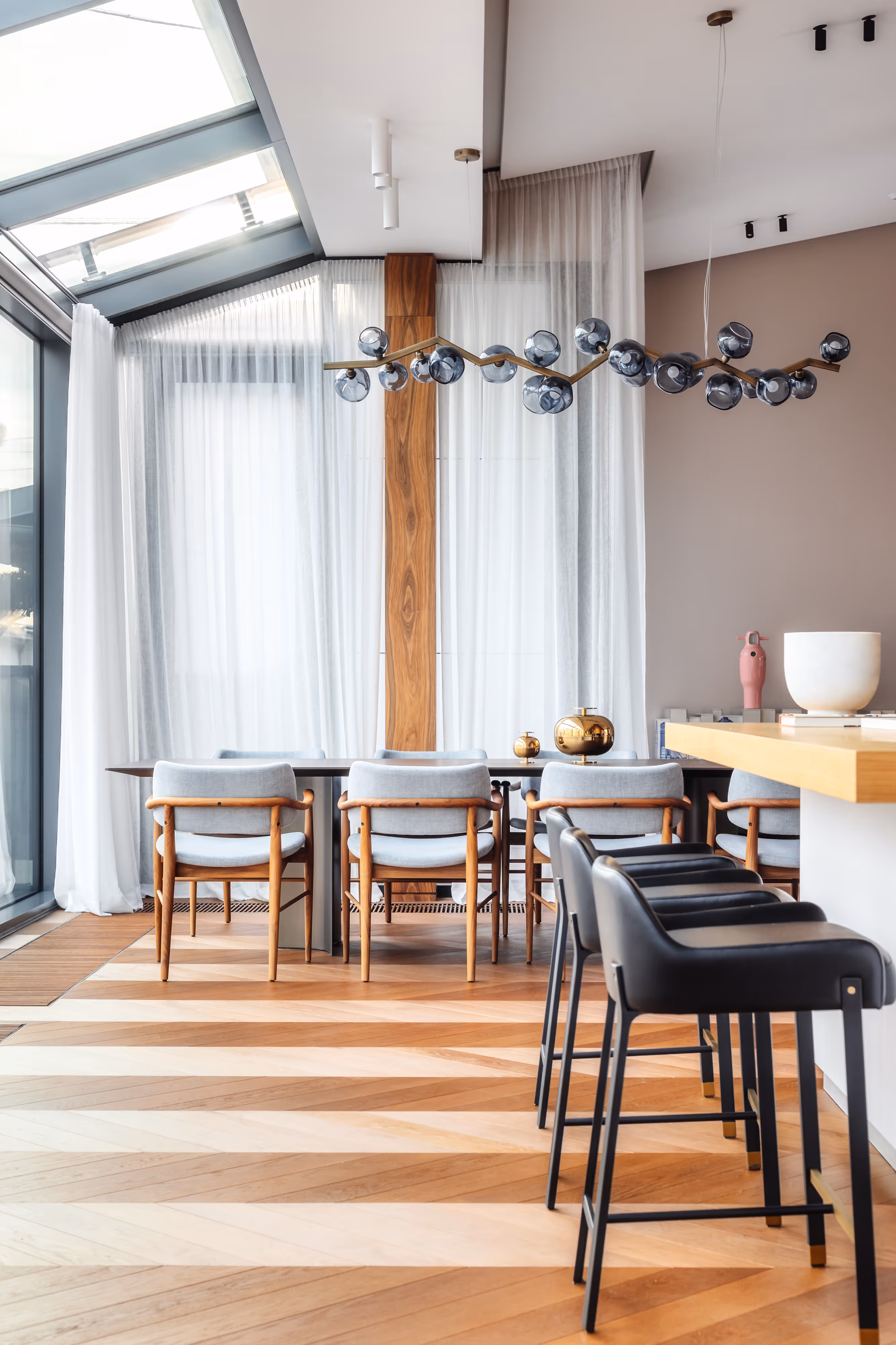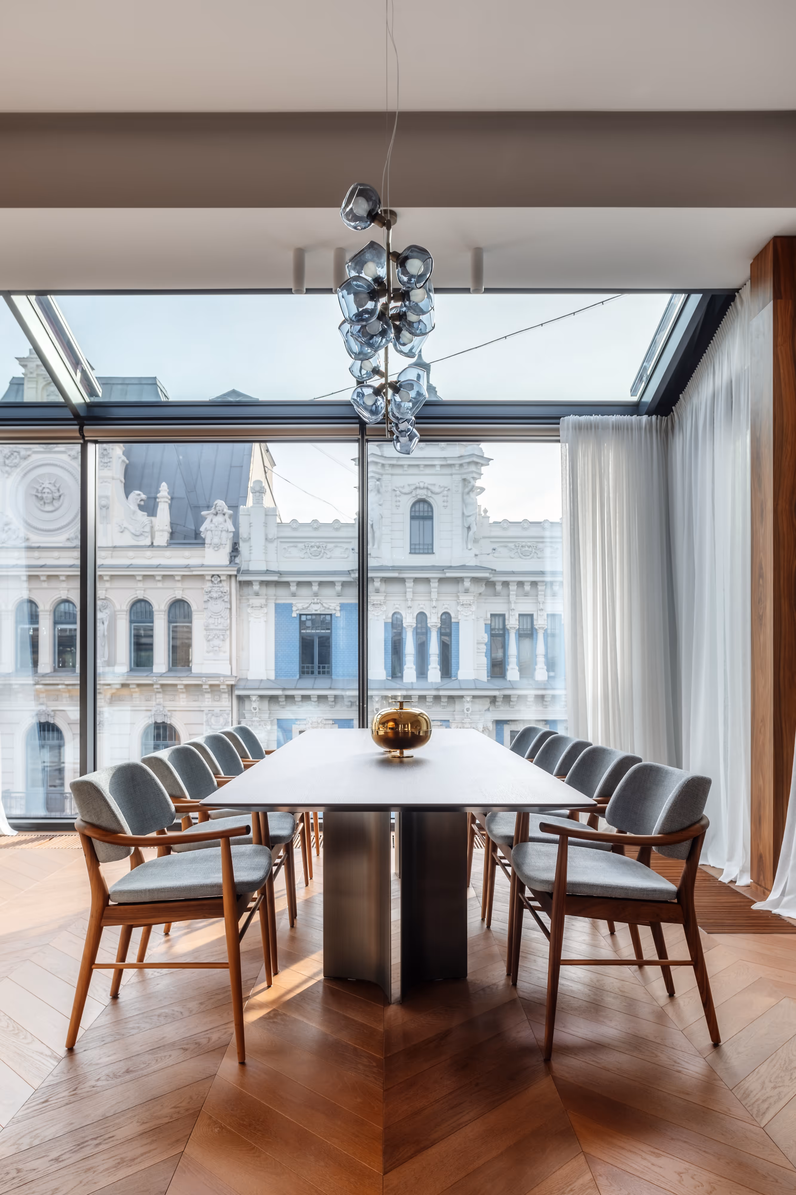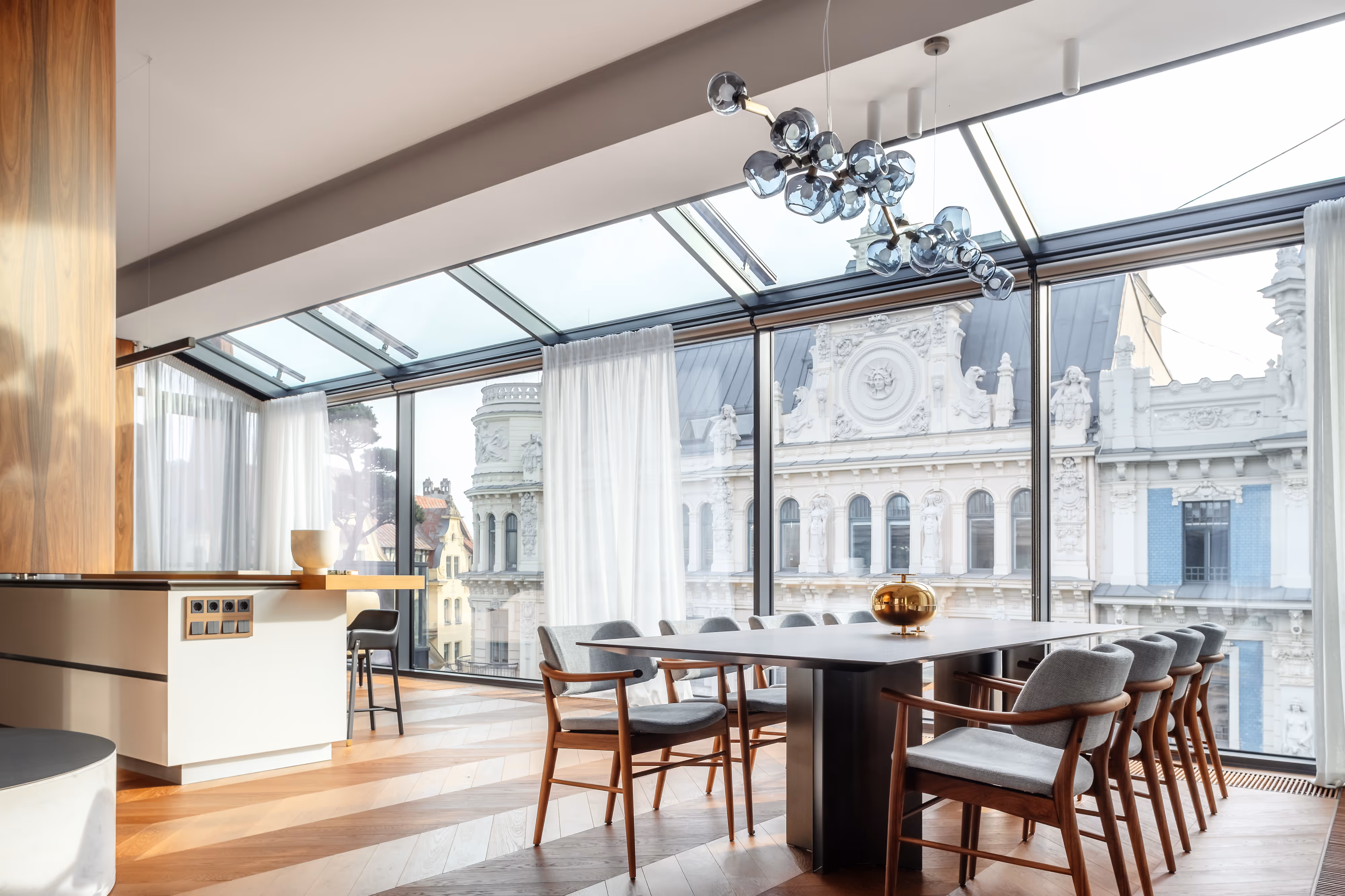 The interior revolves around panoramic windows that open to captivating façades and fill the space with the natural rhythm of the city.