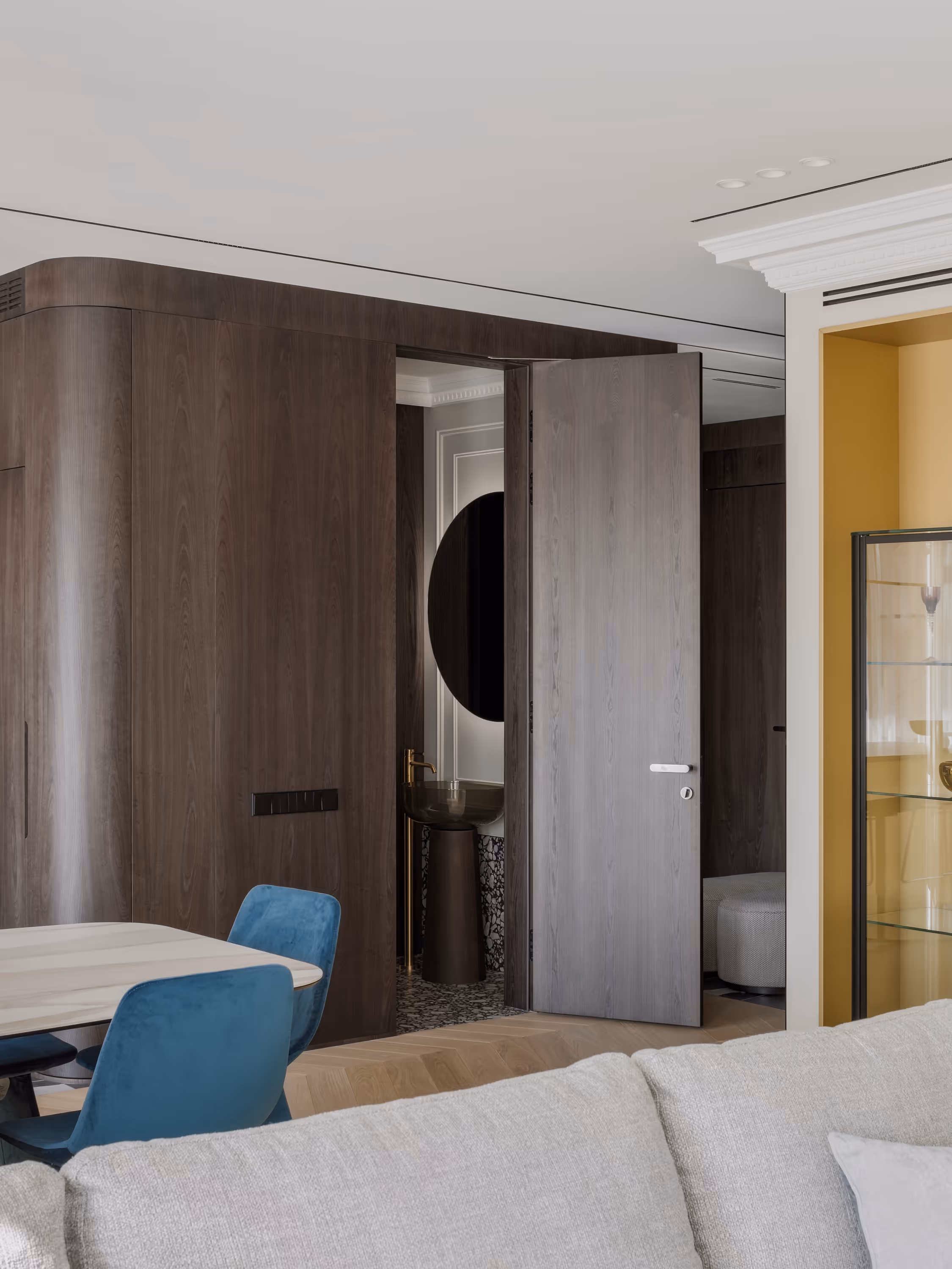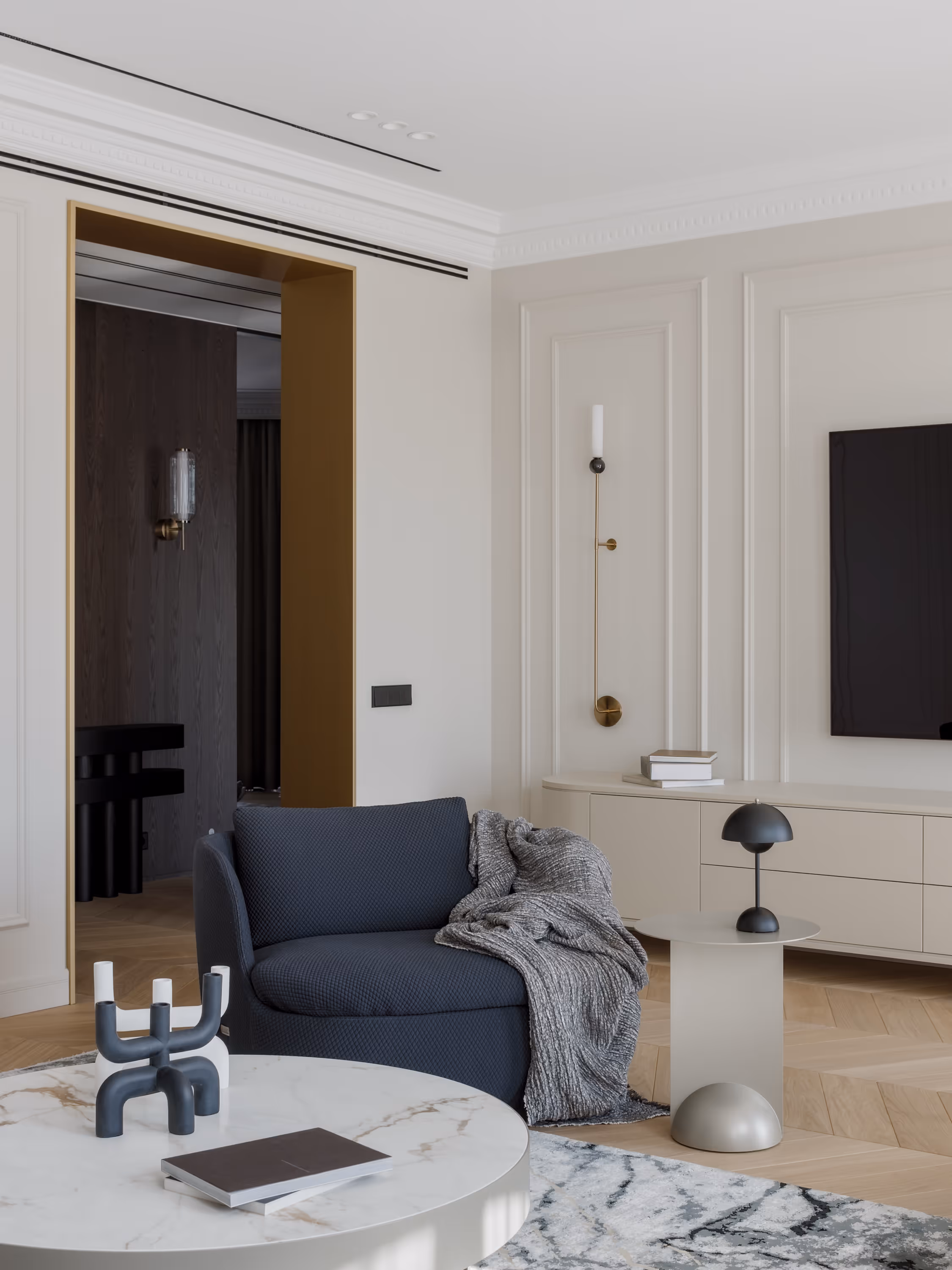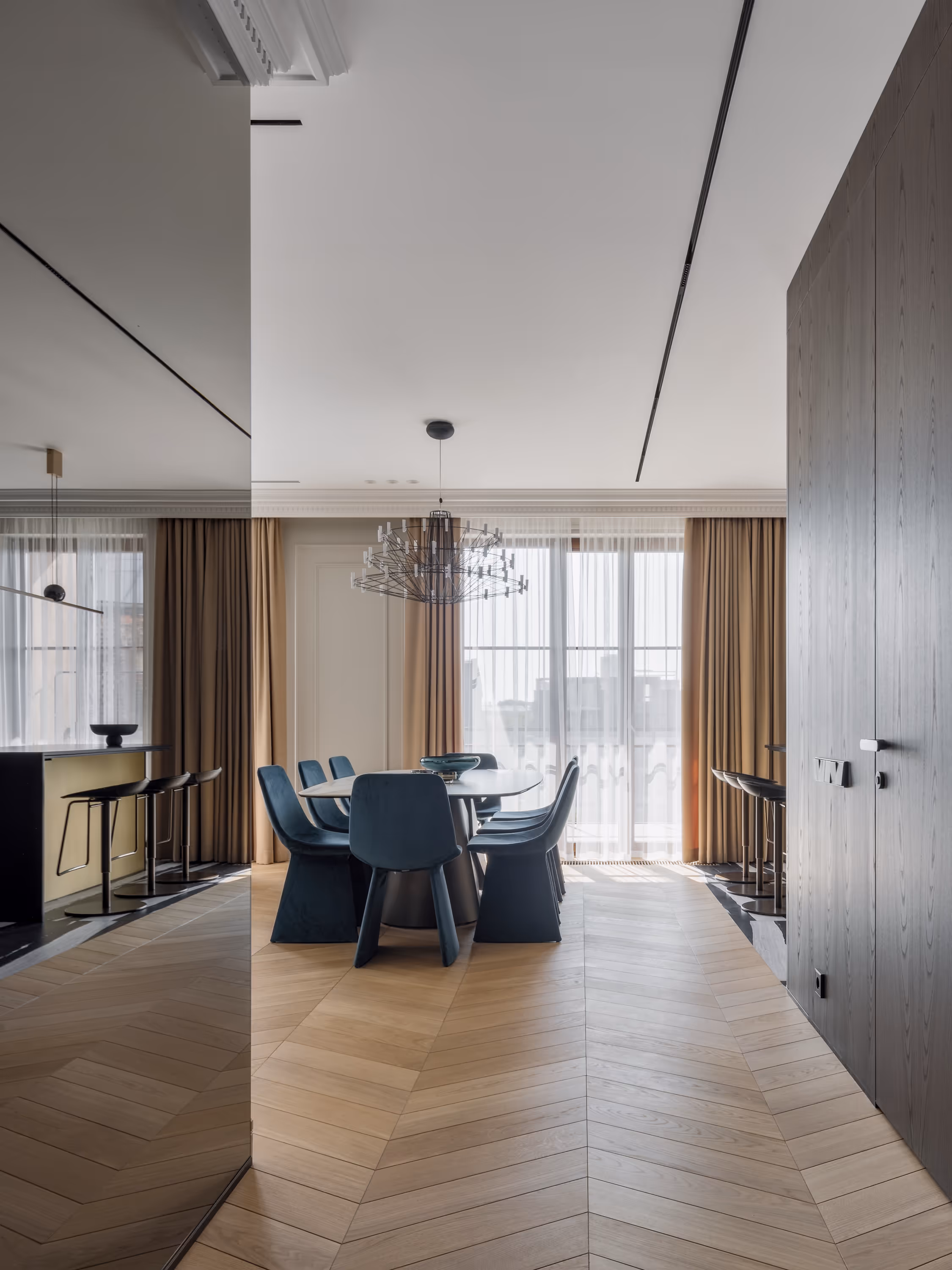 Balti sienas ar plānām lišērijas profilēm, siltais ozolkoka parkets un tumši finiera paneļi veido arhitektonisko rāmi, savukārt dziļi zili akcenti un misiņa detaļas piešķir dzīvīgumu.