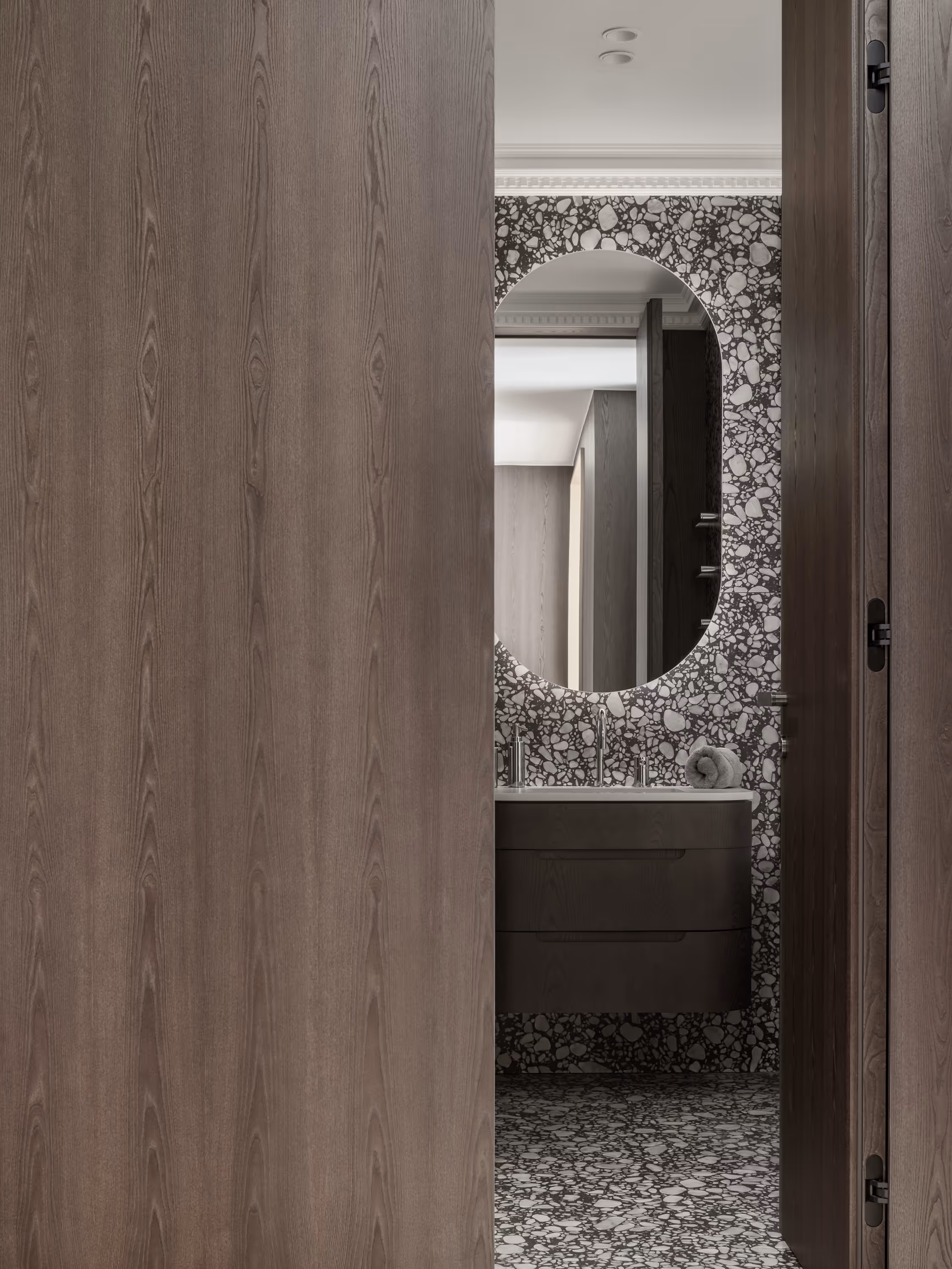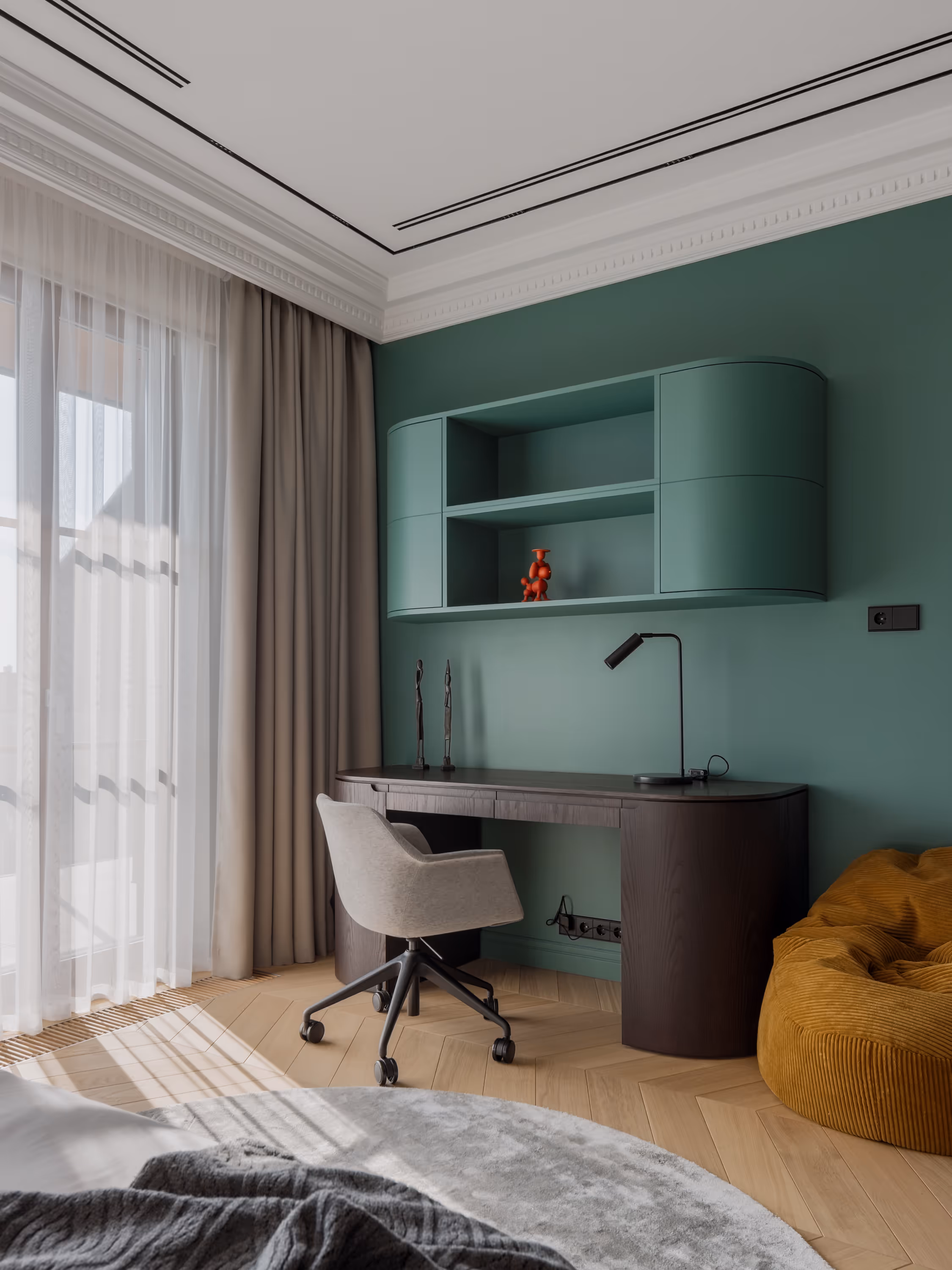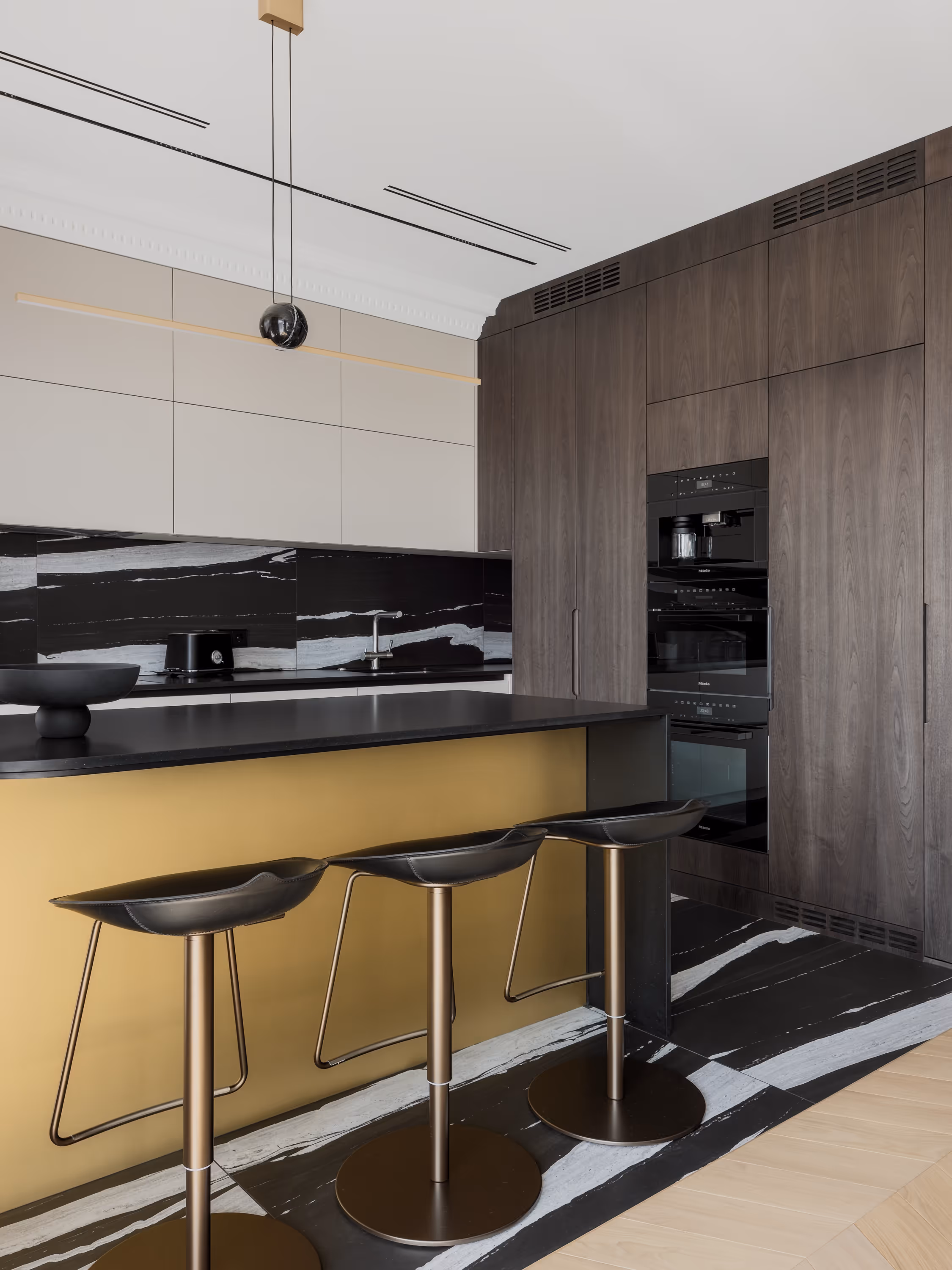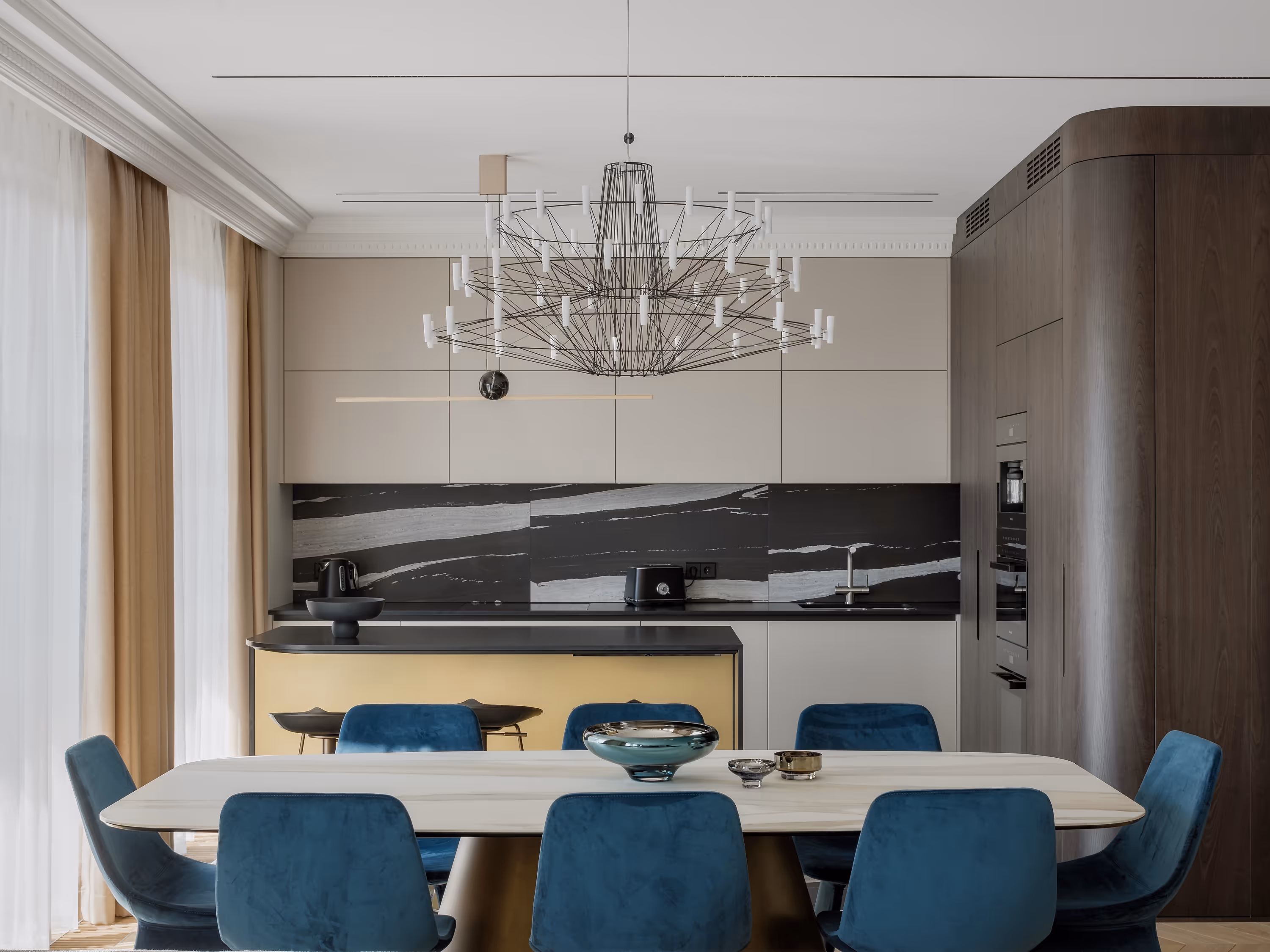 Balti sienas ar plānām lišērijas profilēm, siltais ozolkoka parkets un tumši finiera paneļi veido arhitektonisko rāmi, savukārt dziļi zili akcenti un misiņa detaļas piešķir dzīvīgumu.