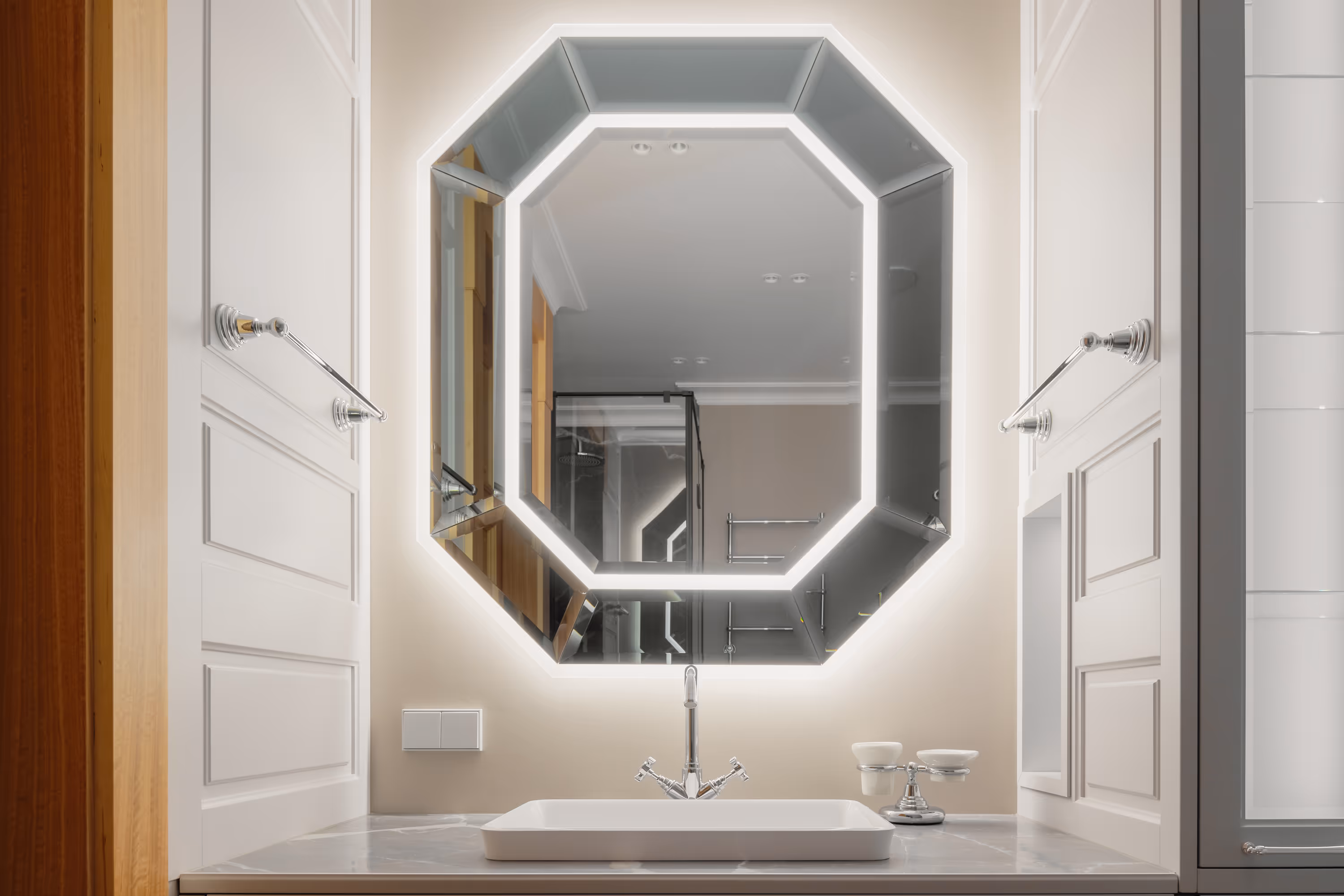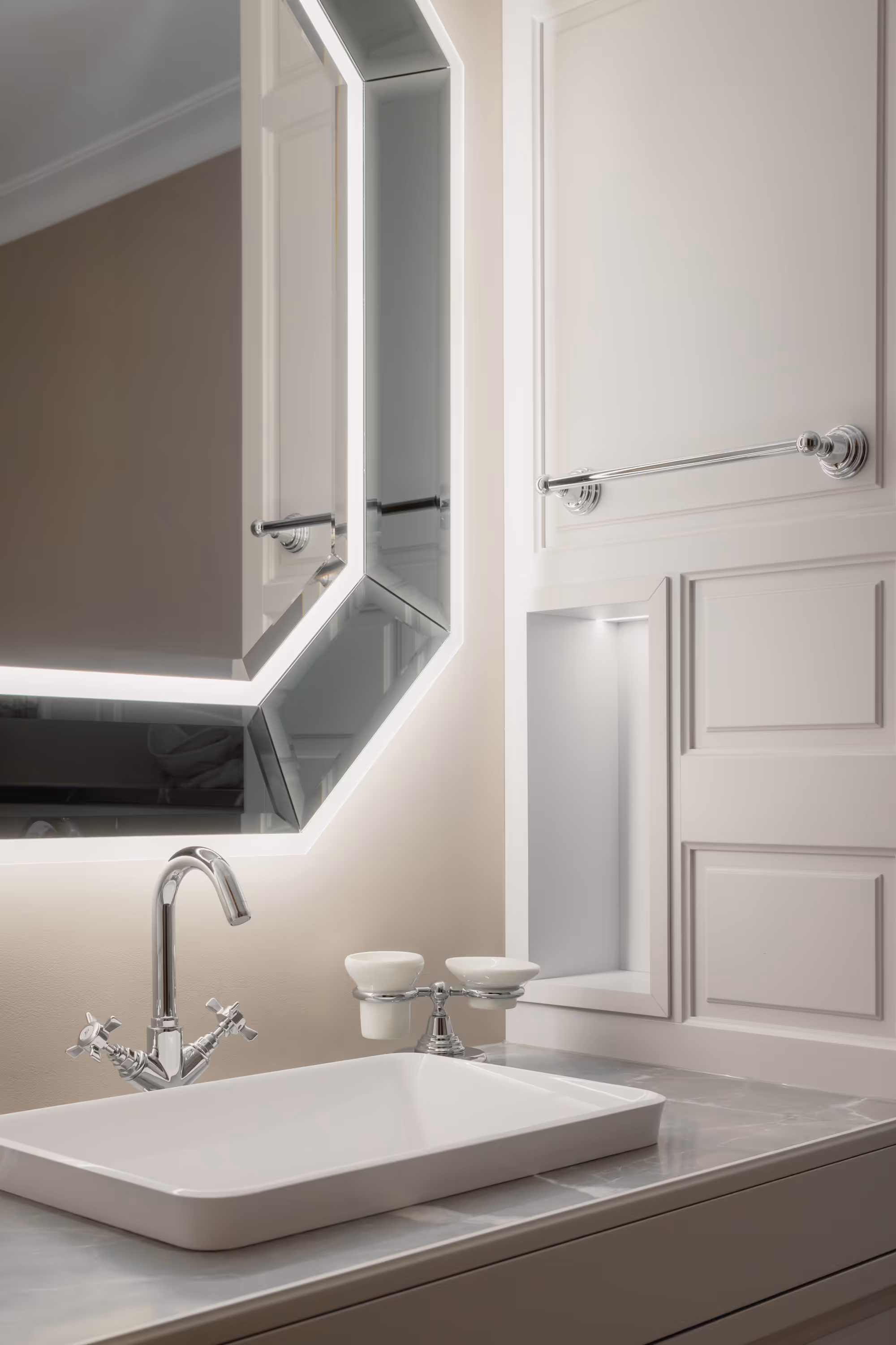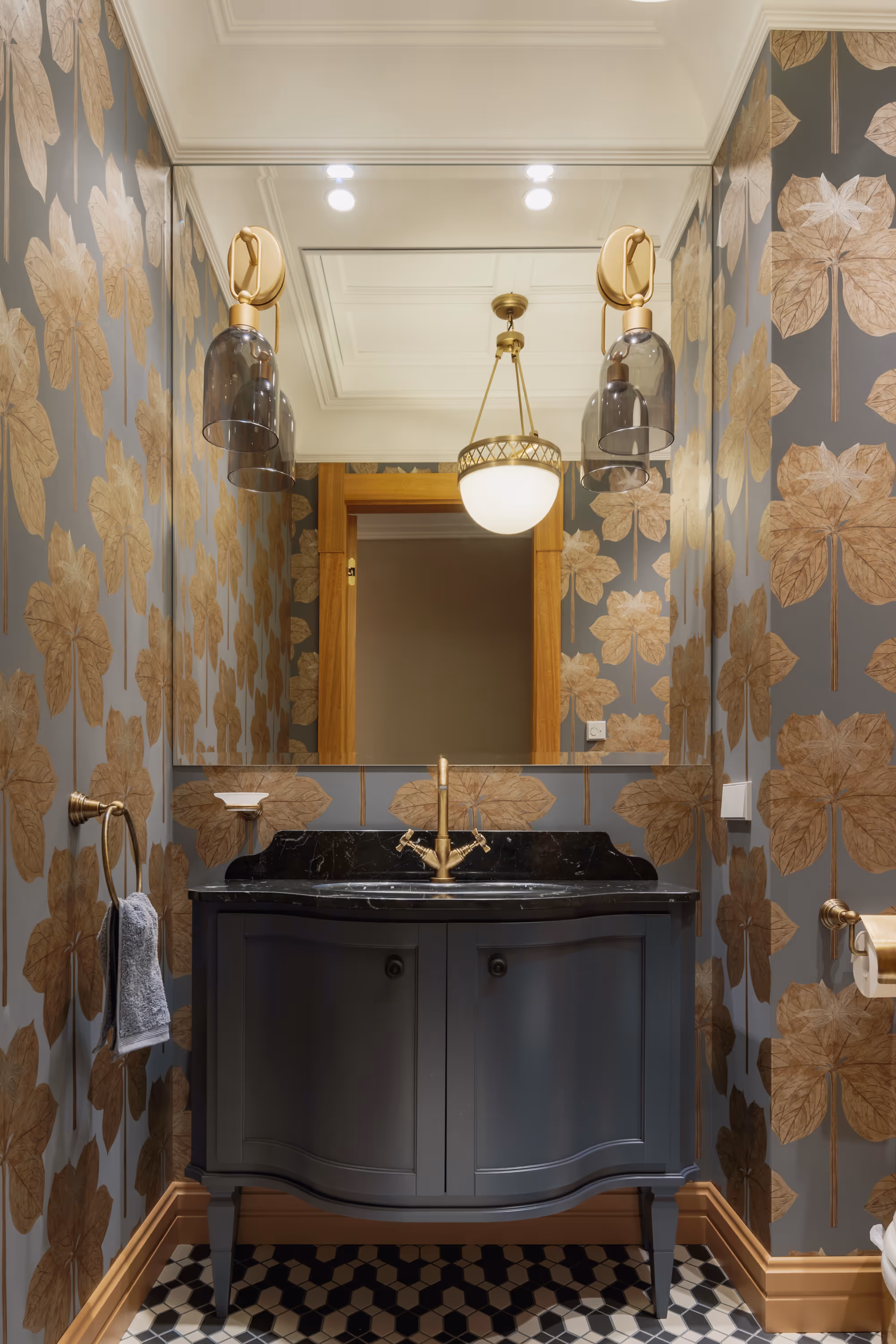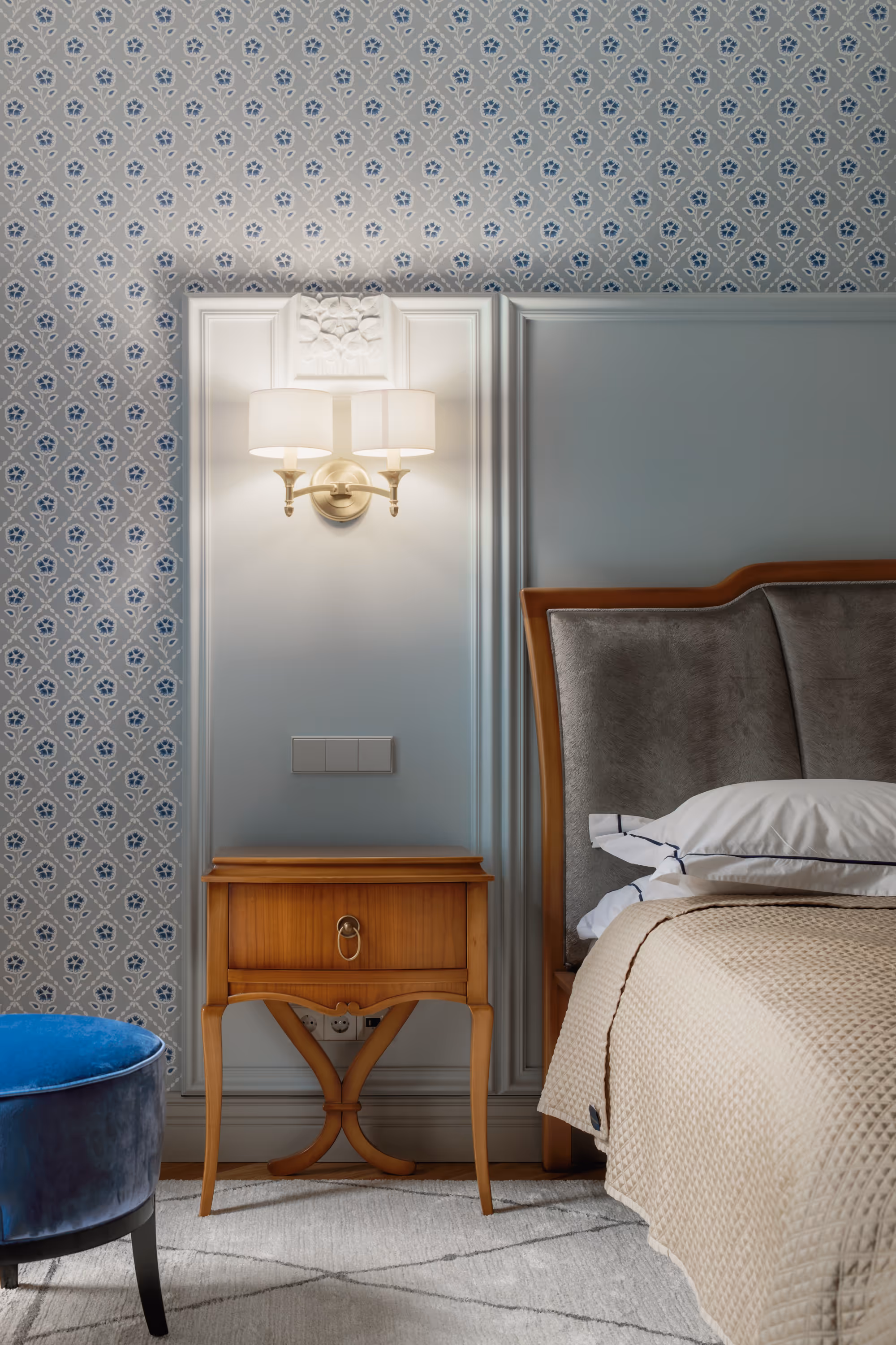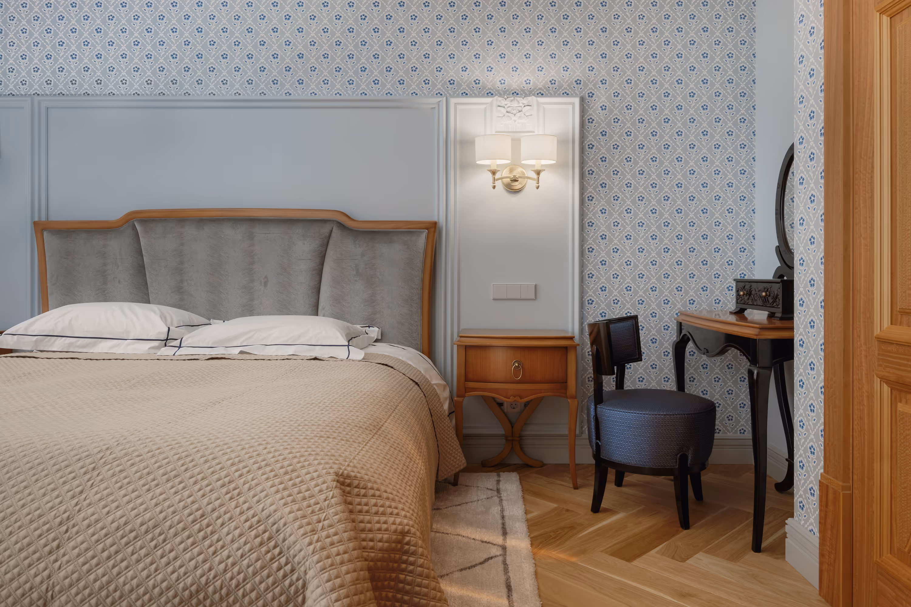 Īpaša uzmanība tika pievērsta mēbelējumam: mēbeles un tehnika izvēlētas no vadošajiem Eiropas zīmoliem, savukārt pēc pasūtījuma izgatavota konsoles galdiņa ar roku gravējumu atspoguļo pretējās ēkas siluetu — cieņa detaļām.